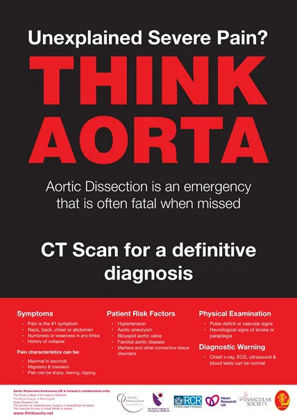 The campaign led to a national investigation by the UK Government’s Health Services Safety Investigations Body (HSSIB), which concluded that recognition of acute aortic dissection is a national patient safety issue. Significantly, many of the charity’s aortic dissection survivors report that their diagnosis was made by a clinician who had previously been involved in a fatal misdiagnosis. The THINK AORTA campaign set about raising awareness of the diagnosis and providing free, high-impact educational resources, featuring real patient stories, to prime the clinical judgement of healthcare professionals and avoid them having to experience such a tragedy. In response to THINK AORTA and the HSSIB report, in 2021, the Royal College of Emergency Medicine and the Royal College of Radiologists published their first ever joint guidance: “Diagnosis of Thoracic Aortic Dissection in the Emergency Department”.