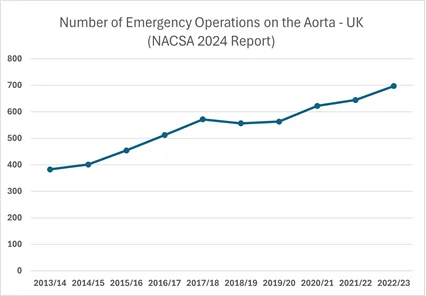 The 2024 UK National Adult Cardiac Surgery Audit reported an 82% increase in emergency Aortic surgery cases over the last 10 years. An additional 315 patients a year are now receiving life-saving surgery. In 2023, the auditors noted this increase is not due to greater prevalence of the disease, but to increased aortic dissection awareness and THINK AORTA.