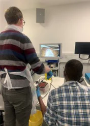 We began our focus on a rabbit model, akin to neonatal size. Trial sessions in the RCSEd wet lab allowed us to develop a number of simulated dissections, namely: open central line insertion, thoracotomy with oesophageal anastomosis, laparotomy with split spouted ileostomy and abdominal closure with Stamm gastrostomy. A downsized laparoscopic simulation box was developed with a piglet stomach mounted inside. This allowed practice of the basic manoeuvres of fundoplication and intracorporial suturing. The mounted tissue can also be reorientated to resemble a tracheooephageal fistula with oesophageal atresia. Thoracoscopic division of the fistula and oesophageal anastomosis can then be practiced. Each preparation requires fine motor skills to complete the task, and we see that the full day of activity helps to ‘kick start’ the necessary conscious focus needed for this type of detailed dissection and operative approach. Refined movements, with minimal tissue damage begin to take shape and trainees feel better connection of head with hands.