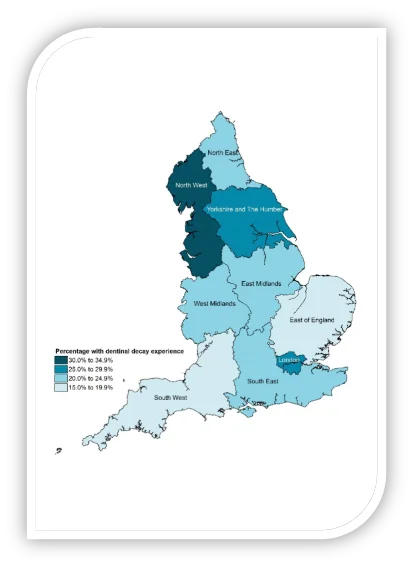 Map 2: Prevalence of experience of dentinal decay in 5 year olds in England by region, 2022