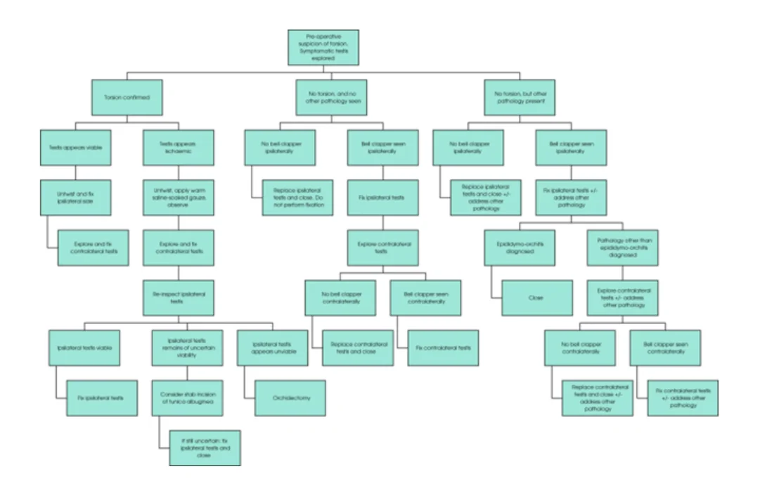 Key recommendations found during this process included discussion of the possibility of orchidectomy (removal of the testicle) during the consent process, and the possibility of an infection of the affected testis or wound requiring antibiotics. If after the examination under anaesthesia prior to starting the operation, the index of suspicion of testicular torsion is lower than previously thought, then the surgeon should still proceed to scrotal exploration as planned. A flow chart guiding decision making dependent on intra-operative findings has been designed and is shown below (Figure 1). If no torsion is present on exploration and bell clapper deformity is absent (abnormal lie of the testicle), the testis should not be fixed. When fixing a testis using sutures, a three- or four-point method is most common in those aged 12 – 18 years. The current ‘gold standard’ investigation and treatment is an operation called scrotal exploration. This allows diagnosis of the twisted testicle, untwisting and ‘fixation’ (stitching the testicle in place to prevent future twisting), usually along with the other testicle.