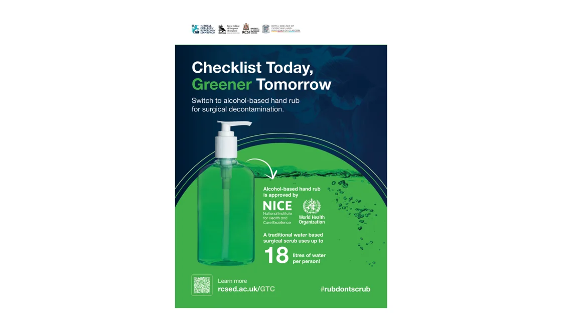 A traditional water based surgical scrub can use up to 18 litres of water per person. Switch to alcohol-based hand rub for surgical decontamination. Alcohol-based hand rub is a liquid agent for surgical hand disinfection containing 60–80% alcohol and is approved by NICE (National Institute for Health and Care Excellence).