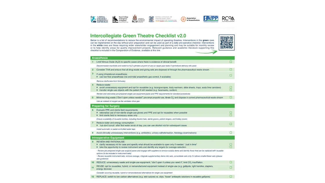 The UK and Ireland Surgical Colleges, the Association of Anaesthetists, the Royal College of Anaesthetists and the Association for Perioperative Practice have all recognised that it is imperative for us to act collectively and urgently to address this issue. Here we present a compendium of peer-reviewed evidence, guidelines and policies that inform the interventions included in the Intercollegiate Green Theatre Checklist. This compendium should support members of the surgical team to introduce changes in their own operating departments. Our recommendations apply the principles of sustainable quality improvement in healthcare, which aim to achieve the “triple bottom line” of environmental, social and economic impacts. This is an emerging field, and therefore this is an iterative document that will evolve with new evidence.